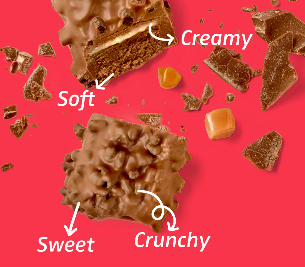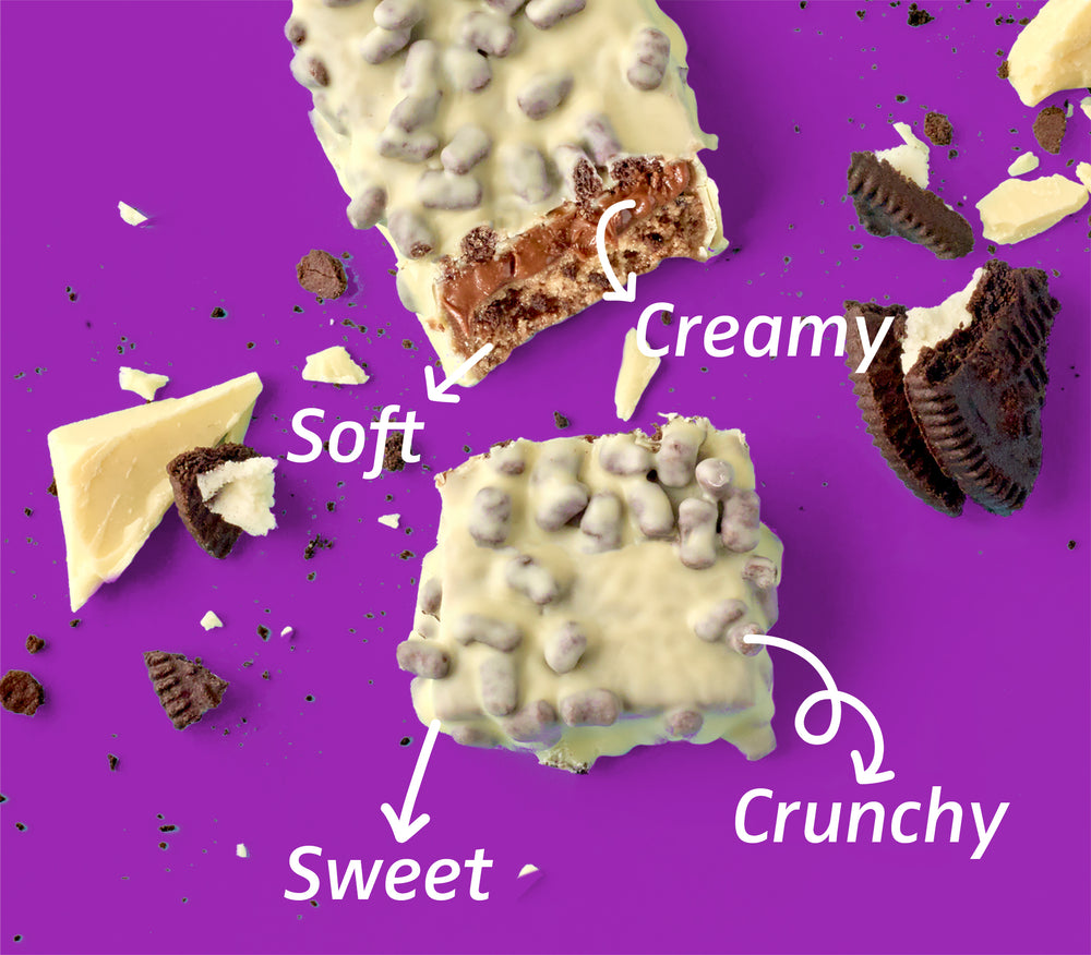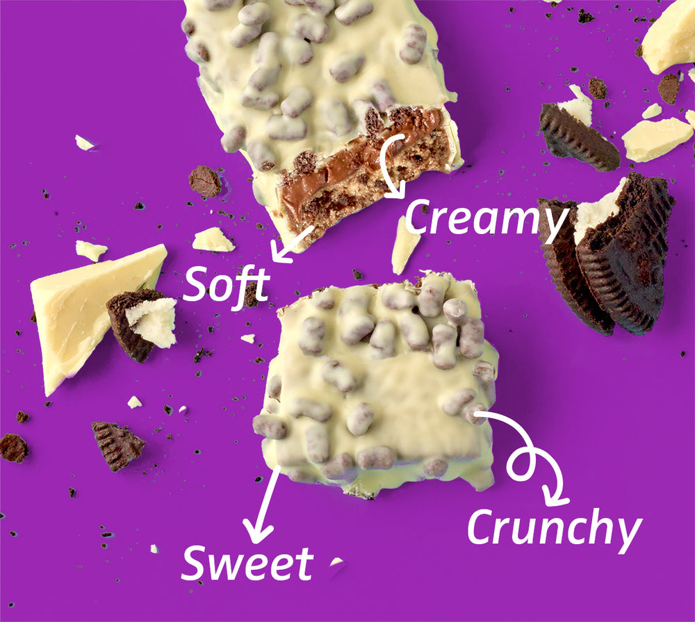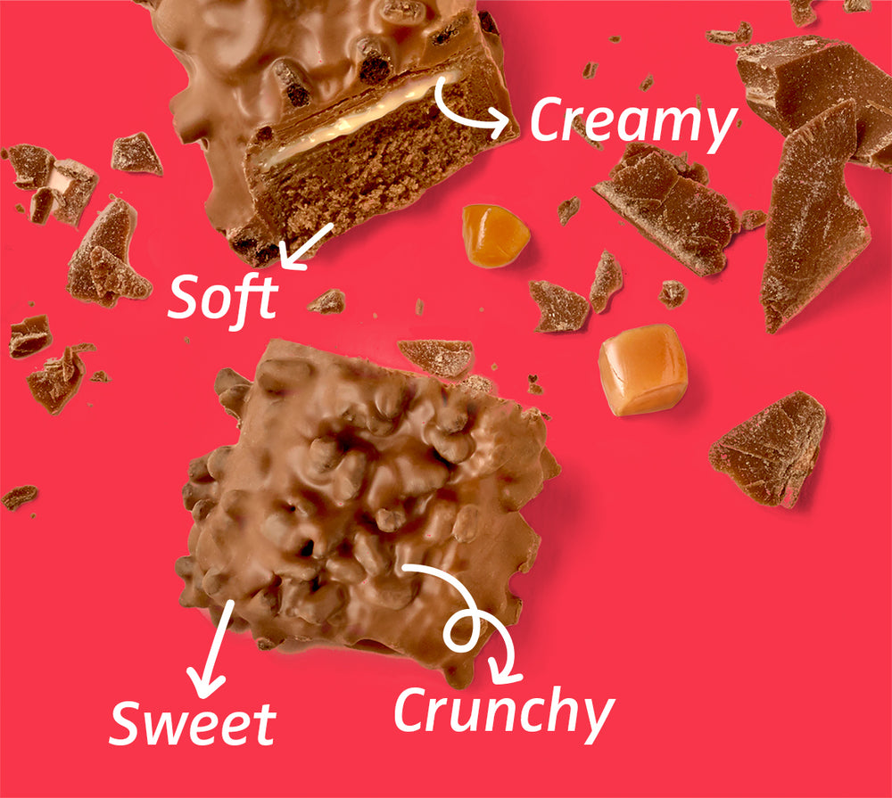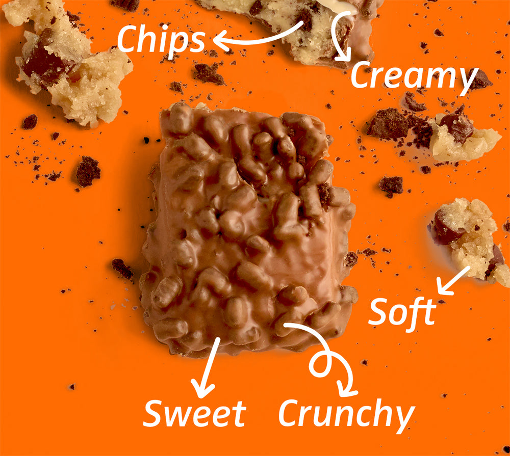 Gooey, crispy, soft. Tri-layer texture in every bar.